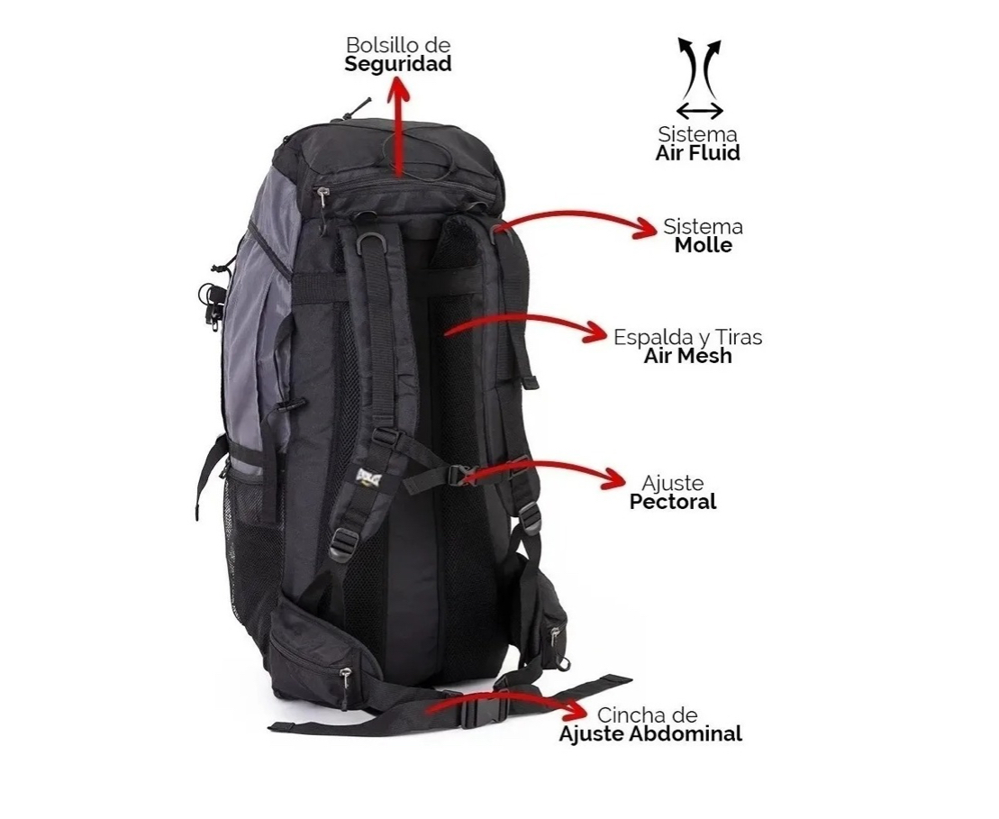 Mochila Everlast (100% Original) con capacidad de 75 litros que se expanden 5 litros adicionales. Respaldar cómodo y confortable con sistema de ventilacion «Air Fluid» y varilla de aluminio para rigidez y ergonomía. Ajuste pectoral y abdominal regulable para optimo agarre al cargar la mochila. Accesos superior e inferior al compartimiento principal. Costuras reforzadas y tela antidesgarre. Un producto de excelente calidad para uso de montaña, viaje mochilero o camping.